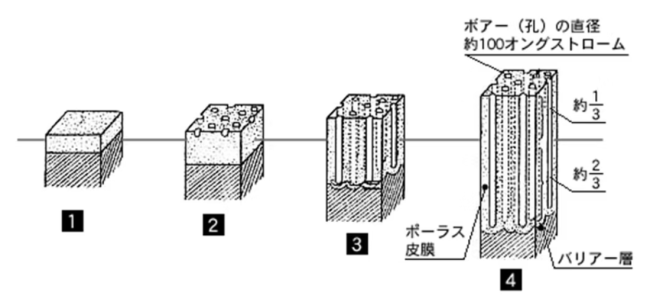人工的に形成されたアルミニウムの酸化皮膜はハニカム構造をしており、ハニカム構造の酸化皮膜中心に微細な孔(ポア)が形成されます。