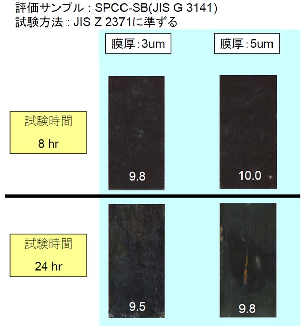 - 塩水噴霧 8時間後:膜厚3µmではやや白錆が発生