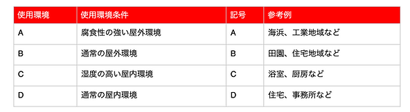 - 使用環境C:湿度の高い屋内環境下(浴室、厨房など)
