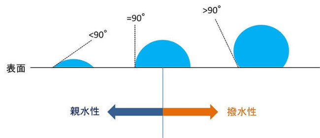 水滴を置いた際に、図のように水滴が表面で丸い球状になり、その水滴と表面が接する角度(接触角)が90°よりも大きければ、その表面は撥水性が高いと判断できます。一方、接触角が90°よりも小さい場合は、水滴が表面に広がりやすいため、親水性がある状態といえます。