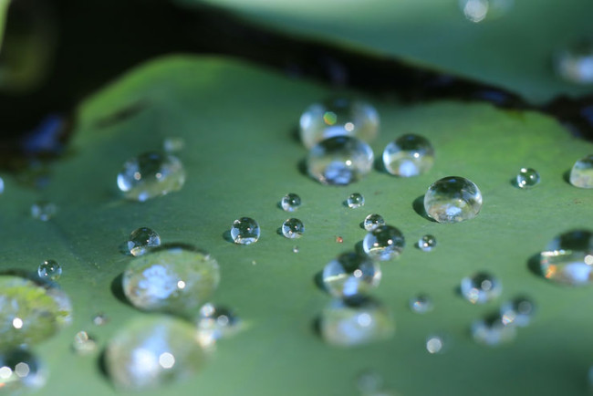 撥水性の高い表面は、水滴を球状にしてよく弾きます。この代表的な例として挙げられるのがハスの葉です。ハスの葉は表面の微細な構造とワックス成分によって高い撥水性を持ち、水滴が転がり落ちる際に汚れも一緒に洗い流すため、常に表面を清潔に保ち、光合成に適した状態を維持しています。