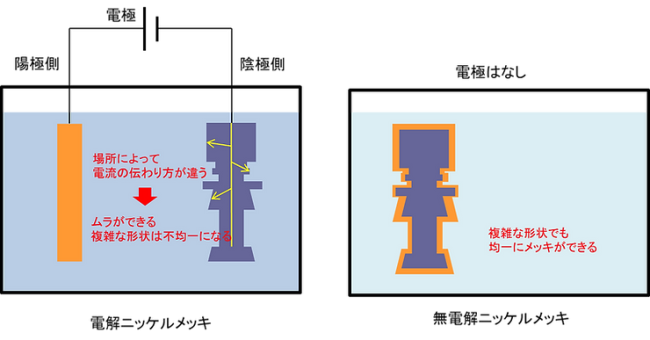 ・均一な皮膜を生成させたい場合は、電解メッキより無電解メッキを選択したほうが良い。