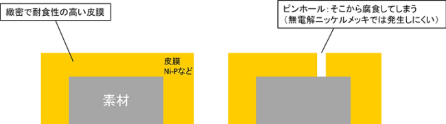 従来の電解ニッケルめっきでは、電極配置の影響により皮膜厚さに不均一が生じる課題がありました。これに対して無電解ニッケルめっきは電極を必要としないため、基材表面全体で化学反応が均一に進行し、均一な皮膜を形成できます。さらに、析出する皮膜は緻密でピンホールの発生も少ないことから、耐食性が大幅に向上します。