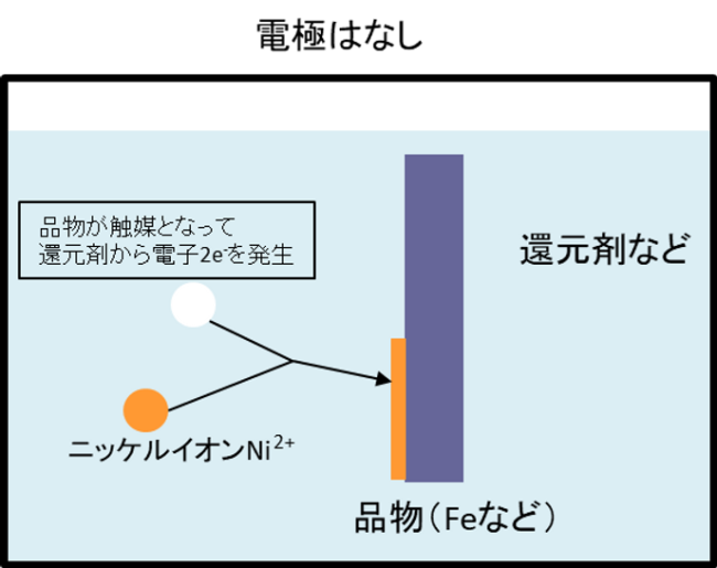 無電解ニッケルメッキの場合、メッキ液内の電解液による作用で化学反応が起き、最初は素材を触媒として電子が発生し、ニッケルイオンを還元して皮膜が生成されます。