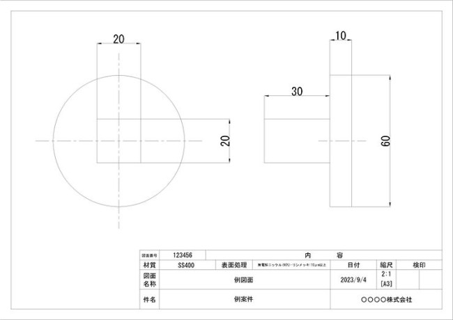 例の図面でも表題欄に表面処理の情報を作っていますが、デメリットとしては文字が若干小さくなってしまい、見えにくくなってしまいます。