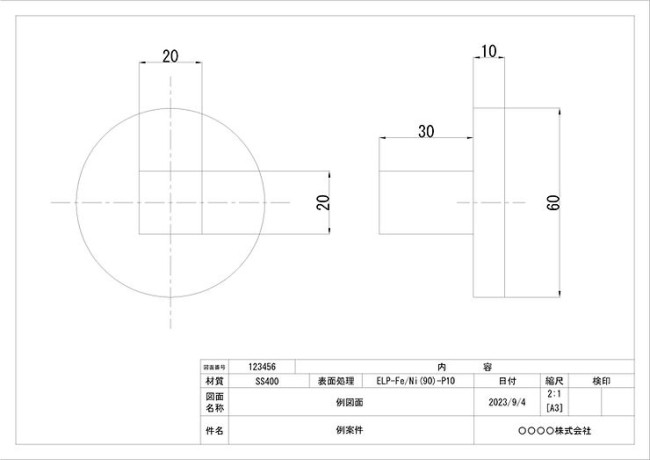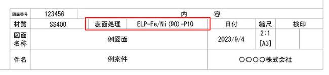 ここに無電解ニッケルメッキであること、その皮膜のニッケルとリン等の含有率、膜厚を記入する方法です。