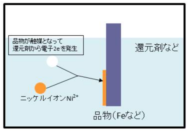 上のイラストに示すような原理で素材にニッケル皮膜を付着させてゆきます。