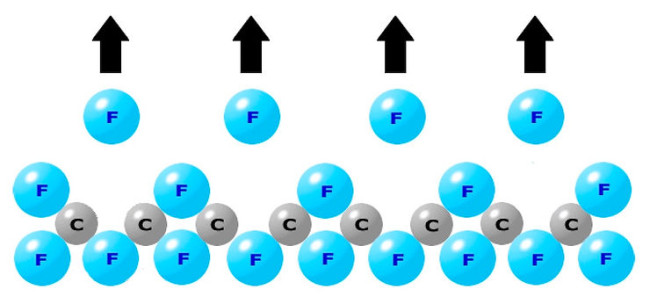 PTFE中に含まれているナトリウム原子(Na)の親ハロゲン性によりこの鎖からF原子を化学的に引き抜き、炭素原子(C)を二重結合などの電子不足の状態にします。