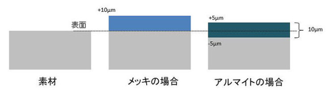 例えば、アルマイトの皮膜の厚みが10μmの場合、元の素材の表面から5μmは厚さが増しますが、残りの5μmは内部に向かって進展してゆきます。
