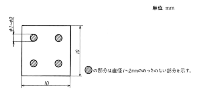 有効面が100mm2以上の製品の場合は,製品の有効面のなかで,約100mm2の指定面積(望ましくは一辺1cmの正方形)を局部厚さの決定に用いる指定面積とする。採用する試験方法によって異なるが,この指定面積内において最高5か所の測定を分散して行う。
