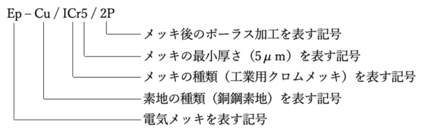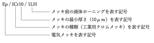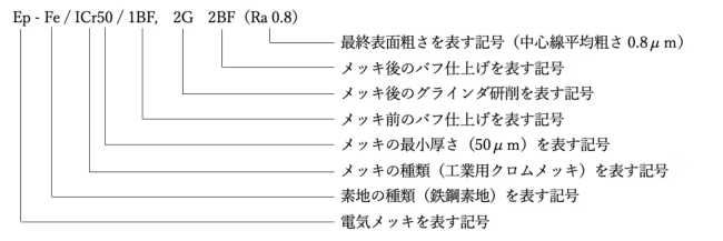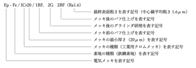 めっきの呼び方は、JIS H0404による。ただし、素地が鉄鋼の場合には、その元素記号であるFeを省略することができる。なお、めっき前後の加工方法は、表1の記号を用いてめっきの厚さの後に斜線を入れて呼び、最終表面粗さは、JIS B0601に規定する中心線平均粗さ(Ra)をめっき前後の加工方法の( )で呼ぶ。