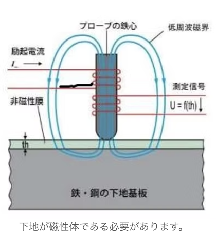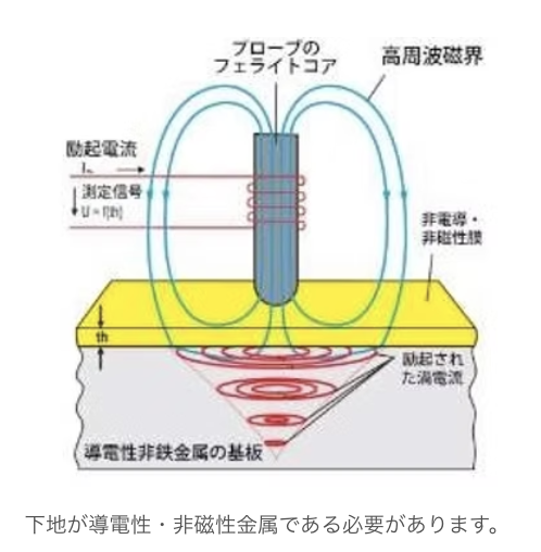 (注)下地が導電性・非磁性金属であり渦電流が起こせることが必要です。ブロープから磁性下地までの距離を測っているので、ブロープの密着度・膜の表面の粗さなどが測定に影響します。