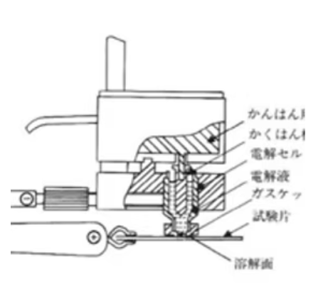 測定面を陽極とし、電解液を入れるセルを陰極として電解を行う方法で、各種の金属に適した電解液で定電流電解によって一定面積を陽極的に溶解し、その溶解されるのに要する時間が厚さに比例することを応用してめっき厚さを測定する試験方法です。
