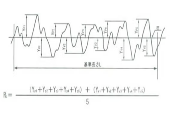 粗さ曲線からその平均線の方向に基準長さだけを抜き取り、この抜取り部分の平均線から縦倍率の方向に測定した、最も高い山頂から5番目までの山頂の標高(Yp)の絶対値の平均値と、最も低い谷底から5番目までの谷底の標高(Yv)の絶対値の平均値との和を求め、この値をマイクロメートル(μm)で表したものをいいます。