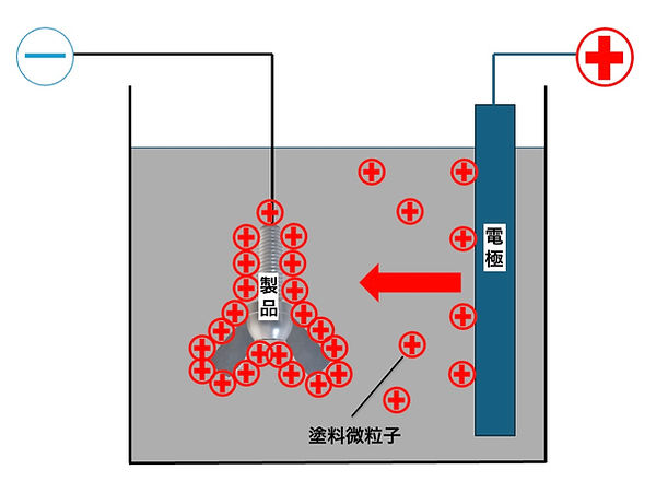 電着塗料の中に製品を浸漬し、直流電流をかけることで塗膜成分が荷電し、被塗物表面に電着させる手法です。