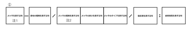 注2.多層メッキの場合には、素地に近いメッキの構成の順に左から右へコンマを付けて順に表示する。